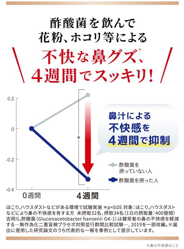 酢酸菌を飲みはじめたら、不快だった鼻グズ※1が、数週間ほどでスッキリ※2が得られて、正直驚きました。